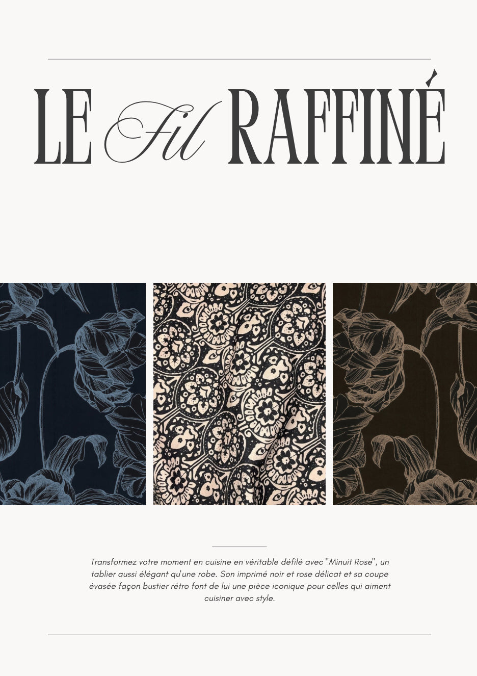 Transformez votre moment en cuisine en véritable défilé avec "Minuit Rose", un tablier aussi élégant qu'une robe. Son imprimé noir et rose délicat et sa coupe évasée façon bustier rétro font de lui une pièce iconique pour celles qui aiment cuisiner avec style.